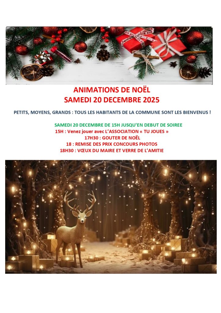 ANIMATIONS DE NOËL SAMEDI 20 DECEMBRE 2025 A PARTIR DE 15H00 SALLE POLYVALENTE SOUS LA…