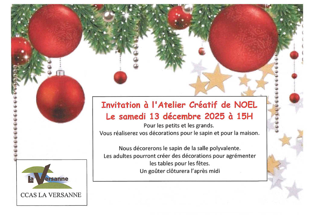 Invitation à l’atelier créatif de Noël le samedi 13 décembre 2025 à 15h Salle polyvalente…